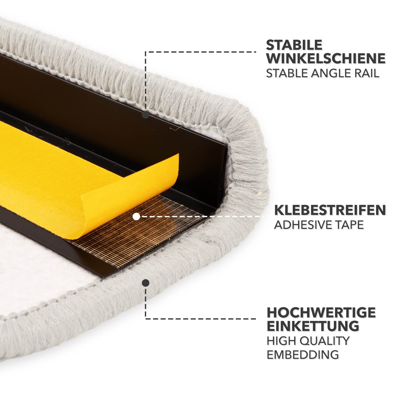 Uwaga: zalecamy oczyszczenie stopni z kurzu przed zainstalowaniem mat na schodach. Ważne jest również, aby upewnić się, że stopnie są całkowicie suche przed zdjęciem paska samoprzylepnego i ułożeniem maty.